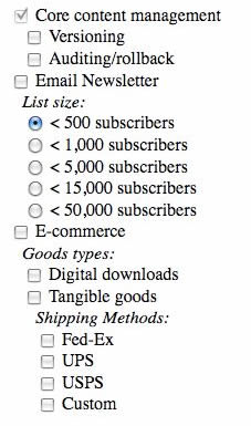 While the DSLs gave us unbounded variability, allowing us to describe any collection of domain objects, controllers and views, we also needed some way to implement bounded variability - a feature model allowing us to quickly and easily configure a first cut of the application which we could then customize from there. In the end we implemented this using a website with a forms-based interface. The system allowed a non-technical user to enter the name of a new project, to select a set of common features such as an events calendar, a product catalog, a shopping cart and a email newsletter system, and then for each to select common sub-features using a simple feature tree. The feature tree supported essential features, optional features and alternate features (with both single and multiple select capabilities). Each feature then added one or more essential or optional statements to the model. So, for example, adding a "product catalog" feature would add a product domain object with an essential title property (there had to be a title property in the generated application). Adding that feature also added some optional statements such as properties for the product object that might be useful but would not always be required. For example, short description, detailed description and price would be optional properties (unless you added a "cart" feature in which case price would become an essential property).