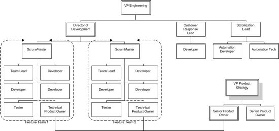 Senior Product Owner - the product manager that is responsible for the product or product lines; this person works with the director to negotiate release schedules and scope and writes the high-level stories (often epics) that drive the release content. This person may also have technical product owners that are embedded in the feature teams to provide local expertise and the additional detail needed by the team.