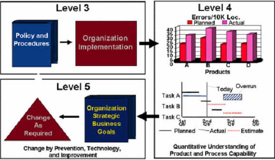 Although we measure things at levels 1 and 2, it is at level 3 that it transforms from a PROJECT tool into an ORGANISATIONAL tool. Only when we have an OSSP do the measurements we take begin to give us information about how the PROCESS is performing. And only then can we begin to decide how to update the process (as opposed to re-write it), to deliver stated business benefits. Level 3 is the fulcrum between (essentially) unmeasured, qualitative processes and quantitatively controlled processes. I'd like to use some slides from a presentation by Dr. Sontakke from ICIL which illustrate the pivotal nature of level 3.