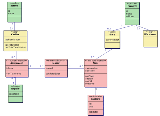 For those who want to know the technical details, FDD makes use of some innovative modeling techniques. The most notable are the use of Colour and the use of Stereo Archetypes. Colour is used to differentiate between such things a Role (Yellow), a Party / Place / Thing (Green), a Description (Blue) and a MomentInterval (Pink) as shown here in Figure 1: