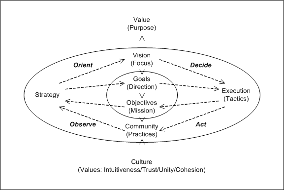 The philosophy of war [3-6] involves the key concepts of strategy, execution (tactics), value, vision, goals, objectives, community, culture, observation, orientation, decision, and action. Strategy involves establishing a vision and goals. A vision is any mechanism (often called an "instrument" or "device") that provides focus, and a goal is any mechanism that provides direction. Execution involves establishing objectives within a community. An objective is any mechanism that provides a mission or commitment and agreement among community members, and a practice is any mechanism used to achieve an objective. The community forms a society with goals and objectives directed toward the vision, and the community's ability to achieve its purpose and provide value is ultimately related to leveraging its cultural values and the intuitiveness, trust, unity, and cohesion among its members.
