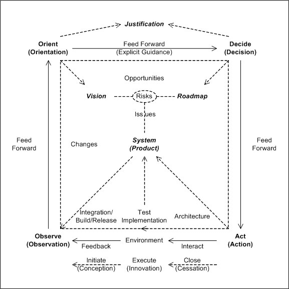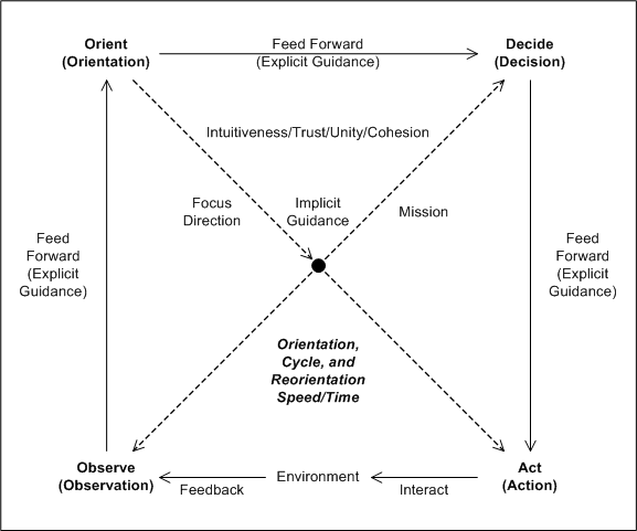 An entity will observe its environment, orient itself toward its vision given its observations, decide how to achieve its vision given its orientation, and act on its decisions. This cycle of activities is known as the OODA (Observe-Orient-Decide-Act) loop. Each activity feeds forward explicit guidance to its successor activity, and because orientation focuses and provides direction for all activities, it feeds implicit guidance to all activities.