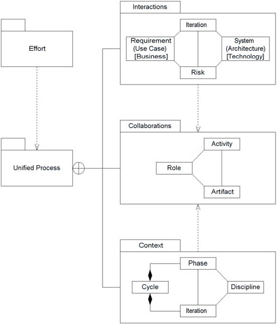 To effectively and successfully apply the UP, we must understand collaborations, contexts, and interactions. As an effort or project leverages the UP, collaborations focus on the elements of the project, context focuses on the process framework for the project, and interactions focus on the execution of the project. Figure 1 shows the various elements of the UP.