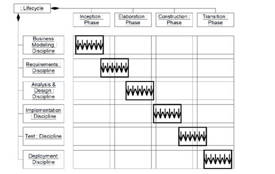 When the first group of iterations focus primarily on business modeling, next group of iterations focus primarily on requirements; and so on through the core disciplines, the team steadily learns more about the problem before learning about the solution as the effort progresses across phases. The effort results in a complete system only at the end of the development cycle. This is commonly known as a linear approach. Figure 3 shows the overall pattern of how effort is distributed using a linear approach.