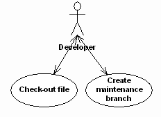 By way of a very simple example, thinking in terms of ALM, we can quickly come up with: Check out file. Our actor will be something like Developer, and we can describe the use case thus.