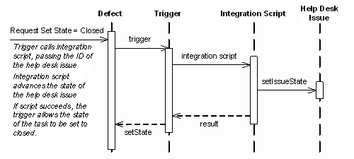 Here, the Support Representative performs the operation to classify the help desk request as a development problem, probably by setting the value of a field. The help desk system (via a trigger) must then invoke an integration script that creates a corresponding issue in the development tracking system. The unique identifier of the development defect is passed back by the script to the help desk system.