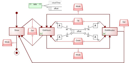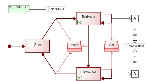 Having a new modeling language, rather than just a model, allows us to make many different watch applications. Figure 2 illustrates amodel of a world time application for the same watch framework, built using thissame modeling language. This application is for a slightly more advanced watch,with an extra Mode button that allows the user to exit this application, orswitch between editing the minutes or hours. The green display function at thetop calculates the time to display: no longer just the clockTime, which is setin the Time application, but the clockTime plus a time zone offset which is set here.