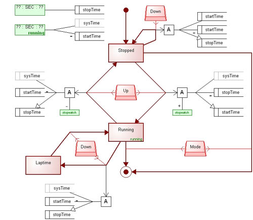 Figure 3 specifies a basic stopwatch application. The model uses a couple of features of the modeling language which were not used inFigures 1 and 2: straight arithmetic calculations on time variables, anddifferent display functions for different states. The display function for theRunning state is the lower green object, and calculates the time to display as the current system time minus the time the stopwatch was started.
