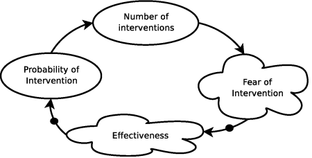 Now history becomes a problem. Rick is willing to take on more responsibility, but is afraid Tom might do more unpleasant interventions like before. This fear lowers Rick's effectiveness when carrying out his tasks independently: he procrastinates, speculates about possible interventions, tries to second-guess Toms wishes. When Rick is ineffective, Tom is more likely to intervene, and with each intervention the fear of interventions with Rick and his colleagues rises. This gives us the vicious circle in the following diagram (The symbol
