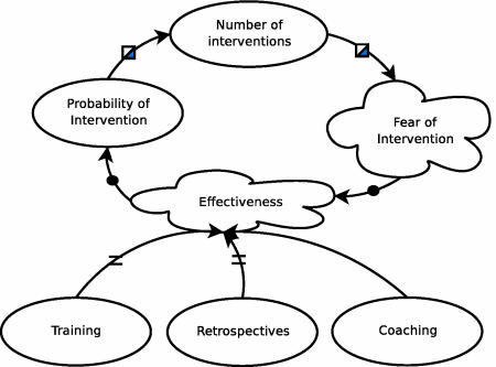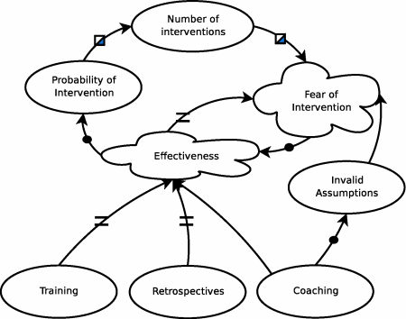 Using the diagram of effects for some of the observations in Tom and Rick's story enabled us to find intervention points to break the vicious circle Tom and Rick found themselves in. Training, regular retrospectives and coaching are actions that make Rick more effective and less afraid of interventions.