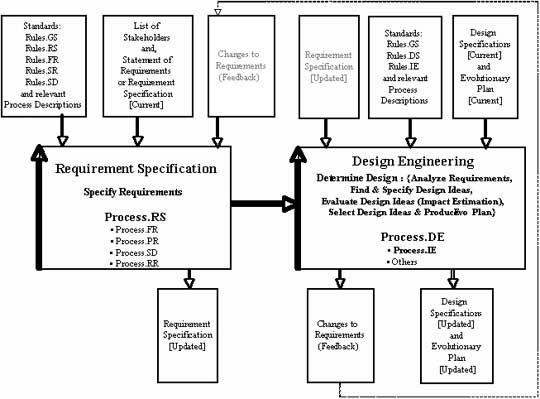 Figure 3. The design engineering process depends on the quality of the requirement specification. The standard for the requirementspecification can be set partly by the specification rules, and partly by thedefect density tolerance (that is, how seriously the rules are taken as measuredby a quality control process). The standard processes and tags (for example, ‘Rules.GS’)refer to the standards published in the CE manuscript (Gilb 2005)