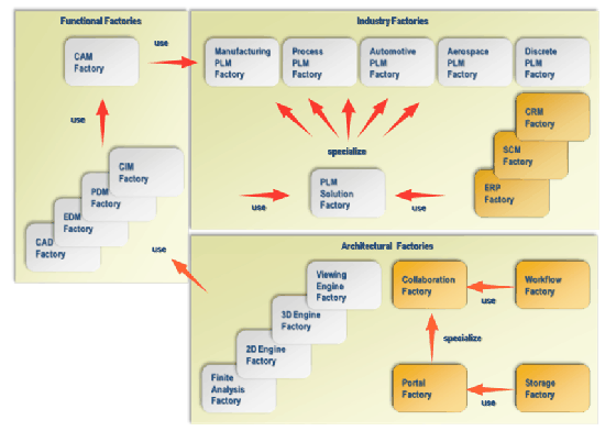 The following diagram illustrates a supply chain for Product Lifecycle Management (PLM) applications assembled from factories. This kind ofindustry architecture and the efficient mass customization it enables is the ultimate goal of the Software Factories methodology.