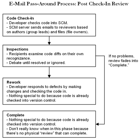 Figure 3. Typical process for an e-mail pass-around review for code already checked into a version control system. These phases are not this distinct in reality because there's no tangible "review" object.