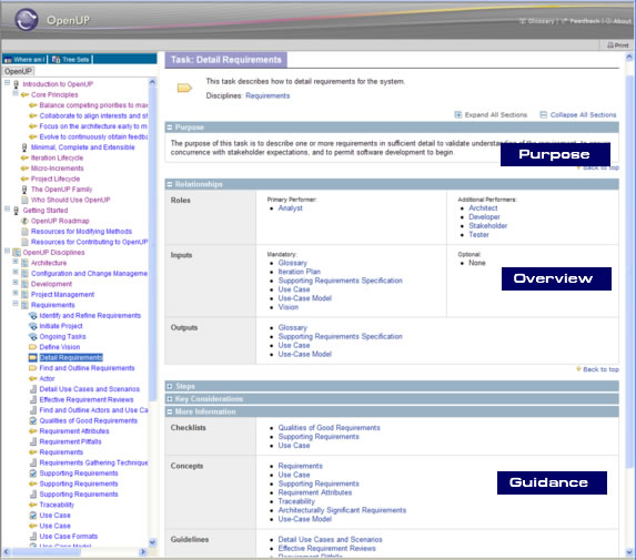 If you are familiar with RUP, you will recognize OpenUP's content browser and some of its content. If you are not familiar with RUP, you will find that OpenUP's two-pane view and content are easy to understand and navigate: