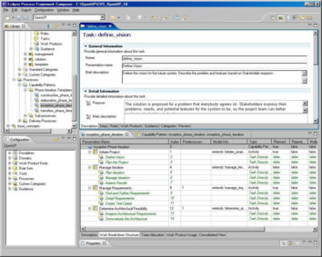 It is centered around a form-based editor which allows you to quickly create and modify content. Your content can be as simple as a couple of additional guidance pages, or it can be as complex as adding completely new disciplines with new roles, tasks, work products and activities. You can even build an entirely new process family and ignore the existing OpenUP content completely. (An interesting example of this is the Scrum process that was developed as part of the EPF work: it uses the EPF process browser but is completely tailored to Scrum terminology and concepts)