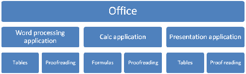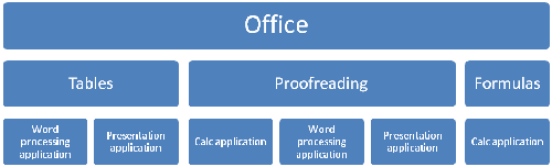 Example of a scaling of the product owner role in a company with an Office product suite including three programs where each feature has its own product owner and the lowest level is responsible for the implementation in a specific application. This can lead to no one taking responsibility for one application
