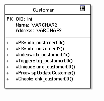 Note that the PK flag on the column 'OID' defines the logical primary key, while the stereotyped operation ""PK" idx_customer00" defines the constraints and behaviour associated with the primary key implementation (that is, the behaviour of the primary key).