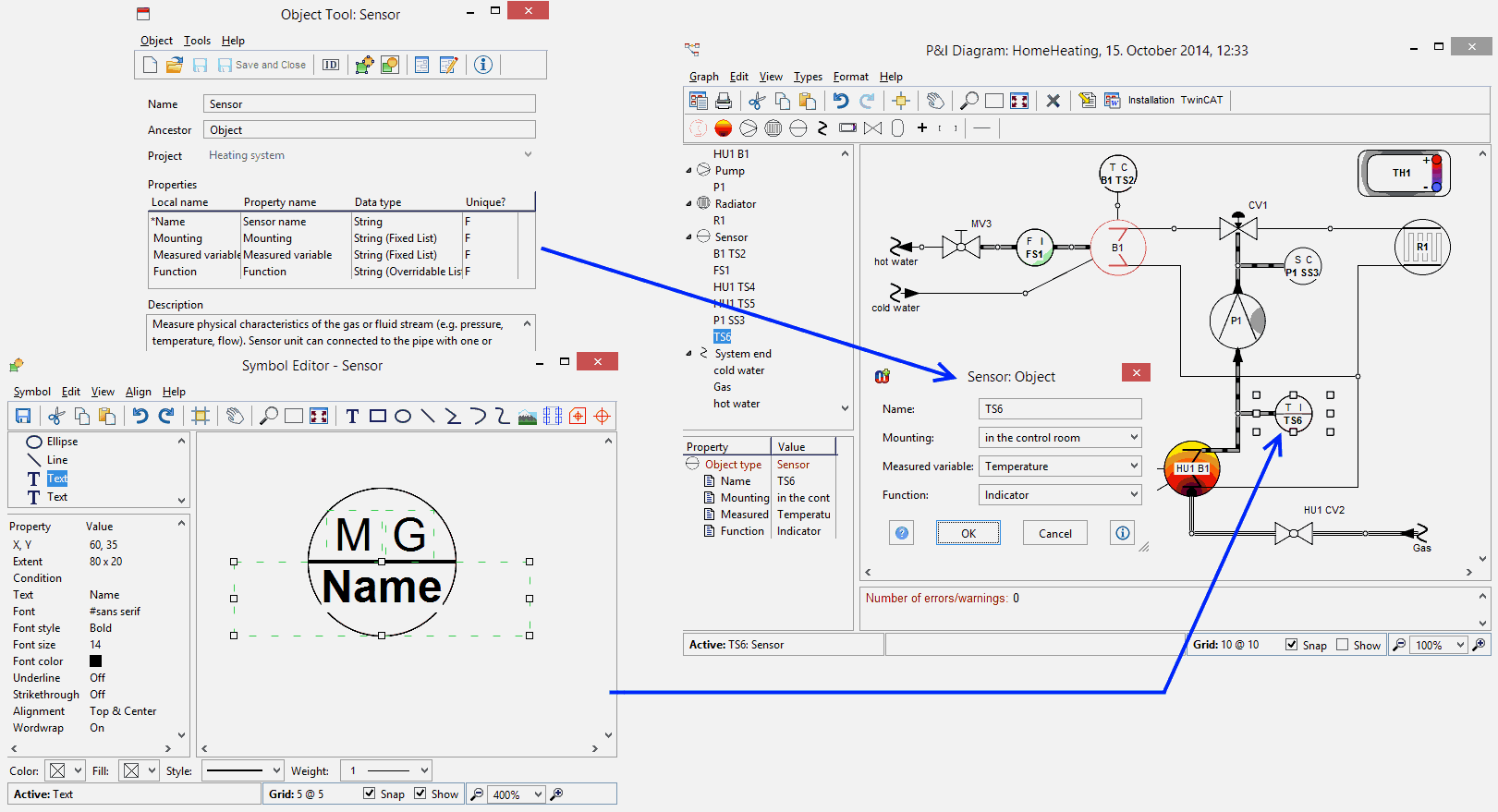 The most typical form of collaboration is between language engineer and language user. In the best case, once any element of the language is defined, language users may immediately test it. An example of such tight collaboration is shown in Figure 2, where the left side illustrates language definition and the right side language use. Within the heating system the language definition on the left shows the concept ’Sensor’ and its properties along with the definition of its notation. The diagram on the right describes its use while specifying a temperature sensor ‘TS6’ that is installed in the control room to indicate the current temperature in the attached pipe. The model showing the sensor can thus describe just those aspects of sensors that are defined in the language (aka metamodel). Also, sensors can only be used in the manner the metamodel allows, e.g. they need to be connected to a pipe but not to another sensor. The language definition may also include more complex rules, like those related to a kind of sensor: e.g. temperature sensors must have one connection to a pipe, but flow sensors must have two.