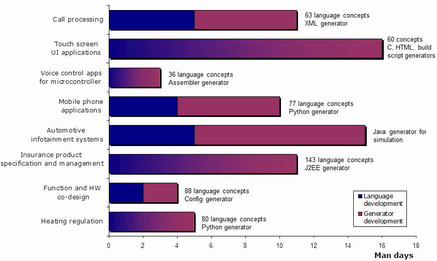 Figure 4 illustrates the division of effort by inspecting the time needed to develop a modeling language and time needed to develop a generator. In these eight cases where data was gathered on the effort needed, the generator development usually took more time than the definition of the language (its concepts, constraints and notation). All the above cases focused on creating a code generator for one target only. When developing several generators, e.g. for different target platforms, the effort to develop the second and subsequent generators is usually smaller. The language is then better known and the generator developer has identified good practices to access models, and may reuse parts of the existing generators. For example, at Panasonic the second generator for a different, albeit smaller, target platform took significantly less time than the first one [Safa 2007].