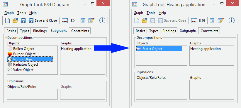 When several domain-specific languages are developed the number of people involved naturally grows too: different people tend to master different parts of the whole system. One language can focus on structures, another on behavior, a third on reusable parts in a library, a fourth on configuration and so on. Figure 5 illustrates the joint development of the two languages in our heating system example. The language on the left, P&I Diagram, is used to define the structure of pipes and instruments of the system. In this language, the behavior of pumps can be described with the ‘Heating application’ language. In other words, ‘Pump’ can be specified in detail with another language. This second language, based on state machines, is described in the window on the right. To support the nesting of states, each ‘State’ within the heating application can be specified with another submodel using the same ‘Heating application’ language. Integration among these languages is more detailed than shown in the figure as both languages also share the same concepts, such as some of the instruments. Examples of these two languages used in modeling were illustrated in Figure 1.