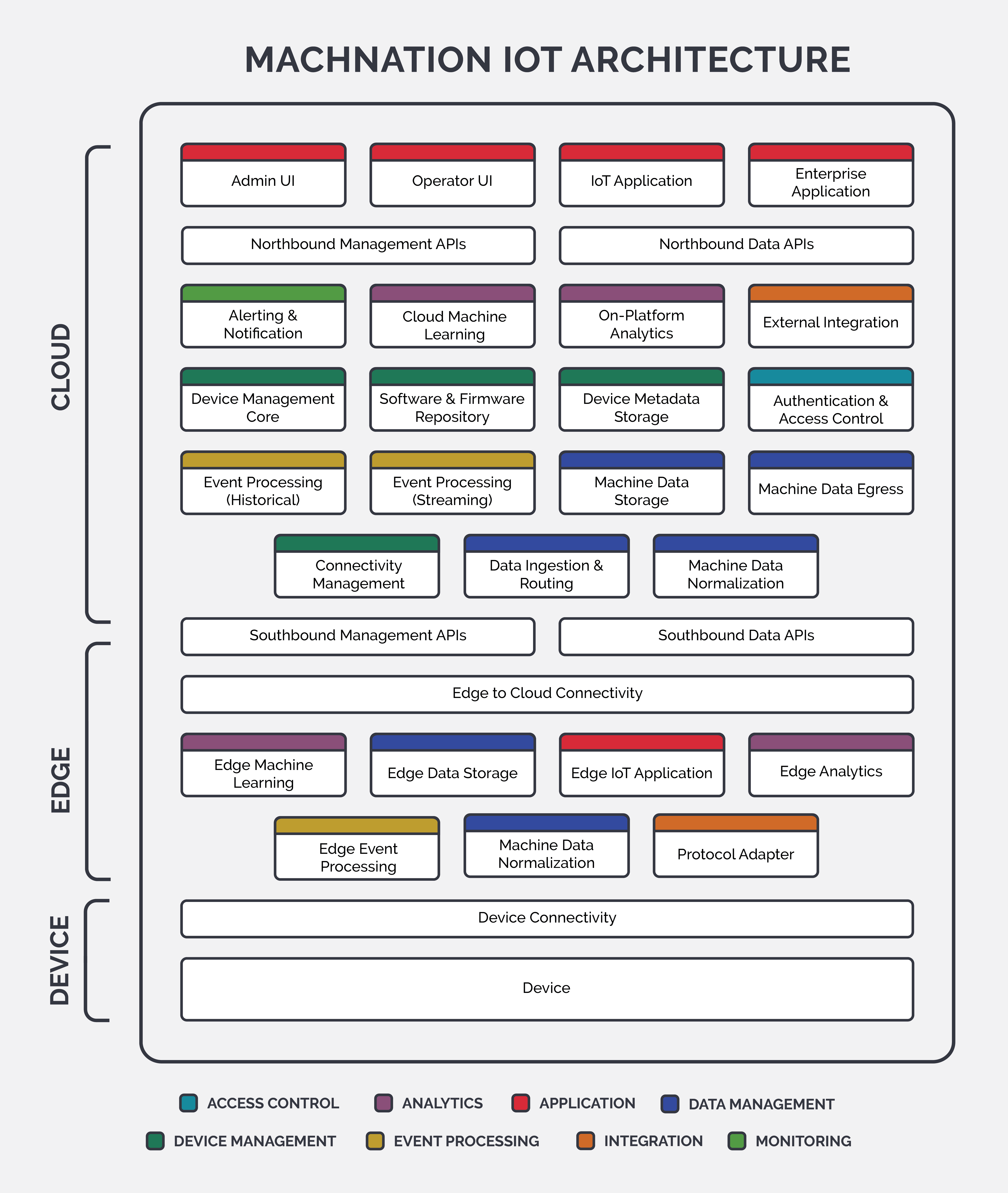 The IoT architecture has 3 primary layers for IoT platform functionality shown as cloud, edge and device. These 3 layers are comprised of a total of 33 functional building blocks. Some of these functional blocks are logically and technologically related, therefore, we have chosen to color code them into the 8 categories shown in the legend: Application, Access Control, Analytics, Data Management, Device Management, Event Processing, Integration, and Monitoring.