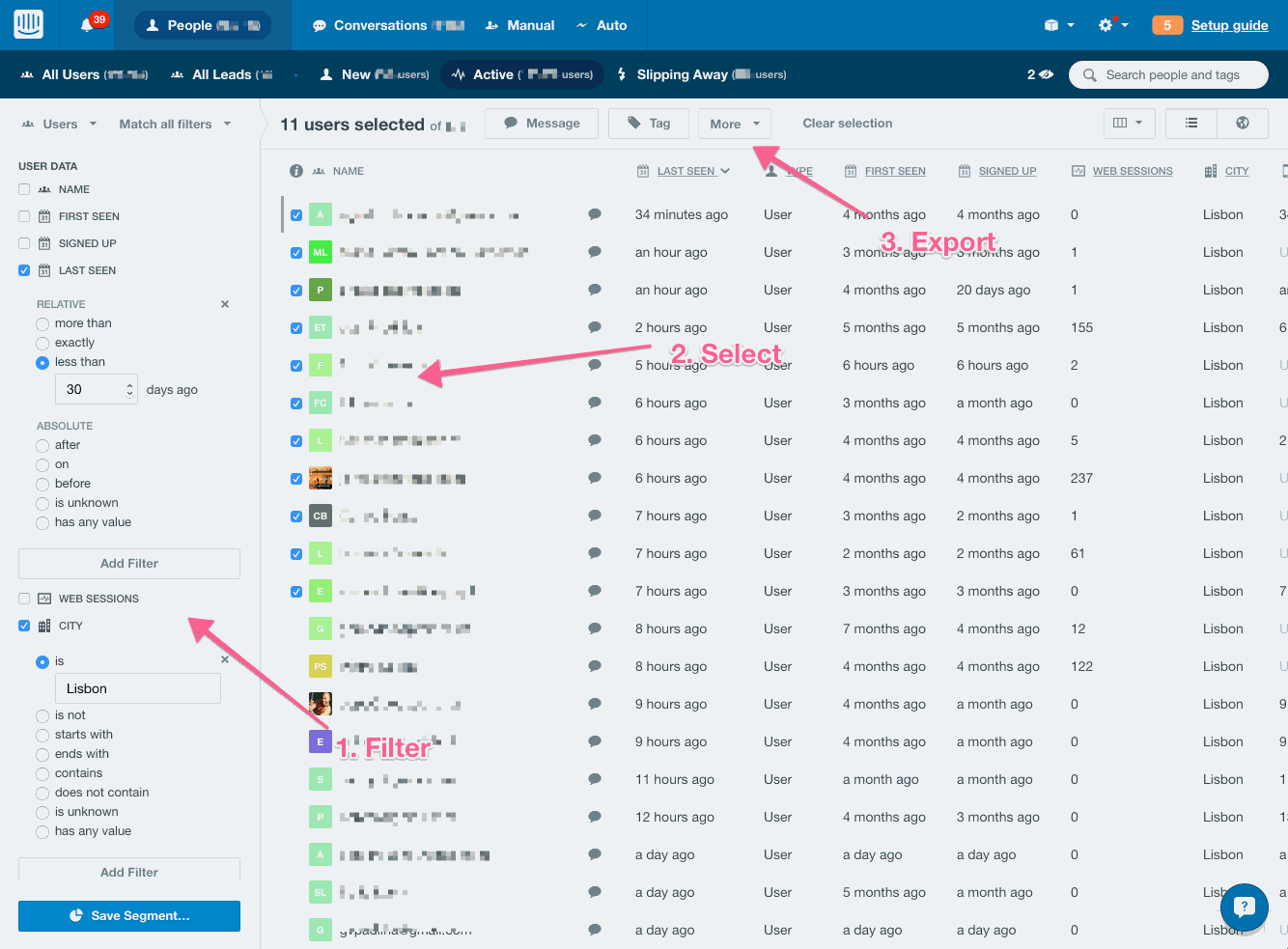 If you're using Intercom [5] or Mixpanel [6], it will be very easy to select a subset of your customers within your target. Then, you should export their basic information into a CSV or Spreadsheet file (I'll explain why in a second.) Here is how this might look on Intercom: