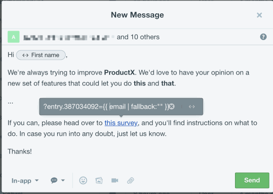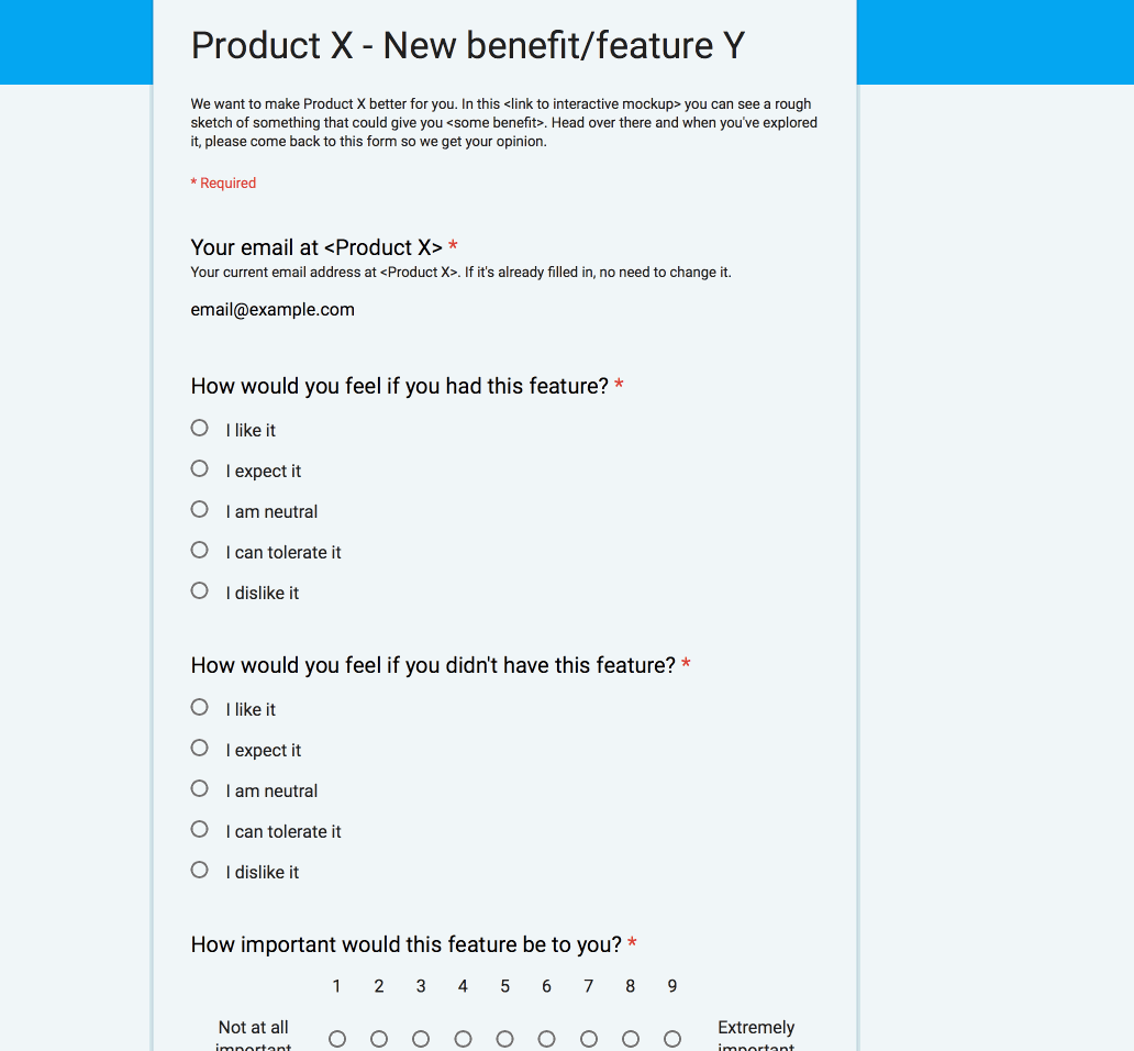 To get responses from our target users, the obvious choice is to go for a survey tool. For this, it's preferable to use a Google Form [13] because of two reasons: it sends results straight to a spreadsheet (which comes handy on step 3) and it allows you to have a field pre-filled by using an URL parameter. This is important because we need a customer identifier (like their email), so we can later know which users have responded and the segment to which they belong. Most email and customer communication tools let you add variables to the links that are being sent out, avoiding the need for users to manually add this piece of information.