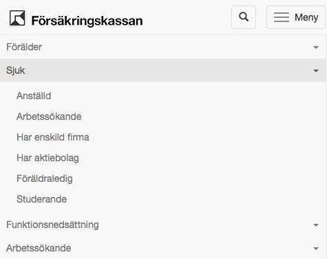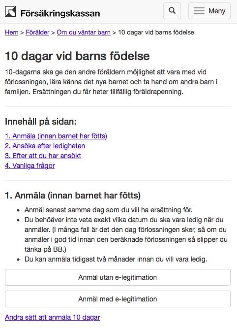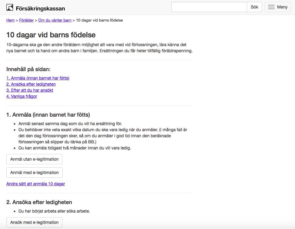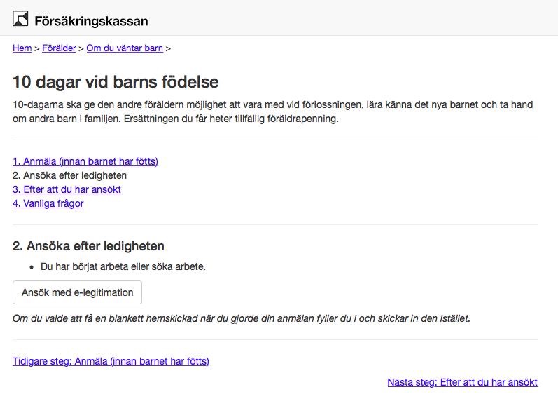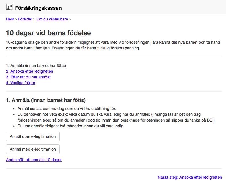 The team decided to test a new concept for the article pages. Many of the benefits require the customer to go through a number of steps and this caused the pages to become lengthy. The team decided to use the "table of content" not as anchor links but rather as a way to change the content of the page. When the page about the benefit was loaded, the customer could see the first step. In order to see the next step, a continue-link was found at the end of the text (Nästa steg: Ansök).