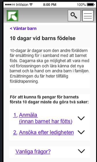 Below: the upper part of the current page on benefits for parents the days after the birth not yet adapted for mobile users.