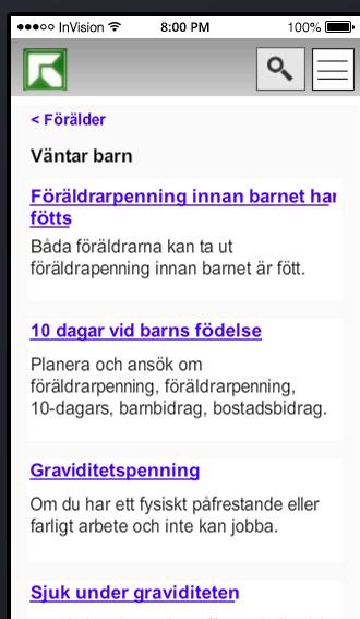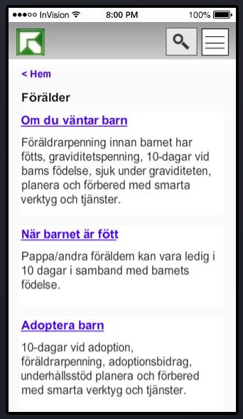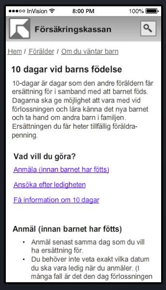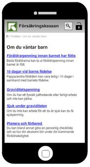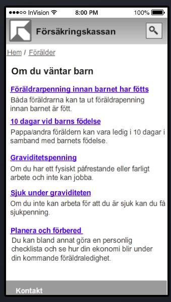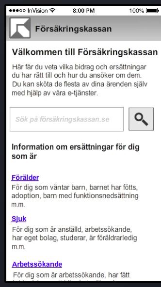 The goal of the pre-study was to prepare Försäkringskassan for the next generation of the web site. The main purpose was to make the web site and its services available to mobile users, but we wanted at the same time take the next steps towards quicker time to market and life cycle management of both content and design components.