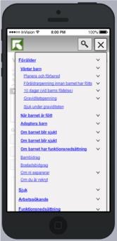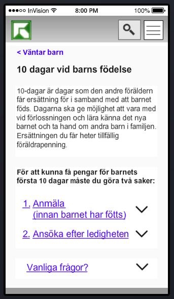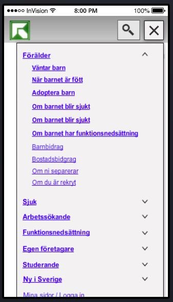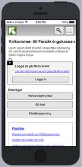 Web statistics had shown that many of the mobile users sought information about how to contact Försäkringskassan. This is not uncommon for all customer groups, but mobile users are more likely to seek contact details than others. The test did not focus on the actual contact page but the team wanted to make sure that this crucial area was easily found for the mobile customer segment.