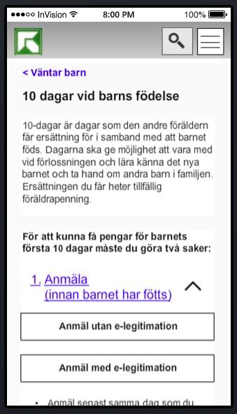 Below: If an anchor link is clicked on the page about benefits around childbirth, the customer can read the rules that apply to this benefit. As you can apply for this in many ways, the two major forms are highlighted as calls to action, while there is a link to the less common options. The reason for highlighting two options is that one requires a e-id, which not all customers have but which is recommended for a complete digital service.