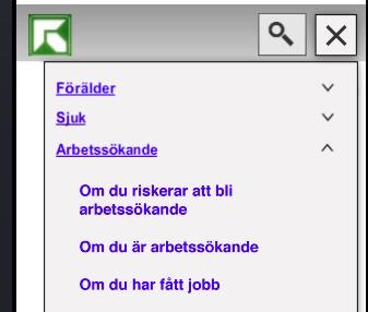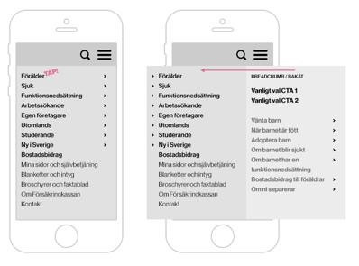 For the first sprint, the hypothesis was that at least one of the four navigation concepts we found from evaluating large sites that are often used by our customer groups (people living in Sweden) would also work for navigating the Försäkringskassan content.