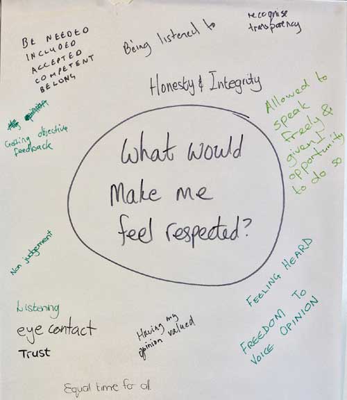 A fun way to do this is to set up two flipcharts on easels in the room where the retro is going to be held. On one write “What would make me feel safe?” and on the other “What would make me feel respected? As people arrive ask them to use the supplied markers to fill in their answers.