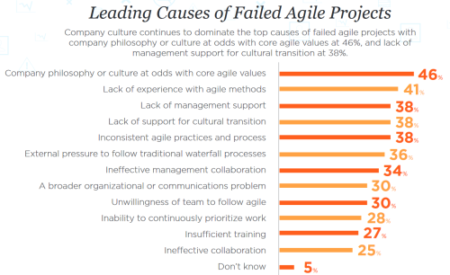 Despite these claims of increasing Agile adoption, the reasons cited for Agile’s failure (The 10th State of Agile report, 2016) revolve around the company culture, management support, and lack of experience with the Agile methods: