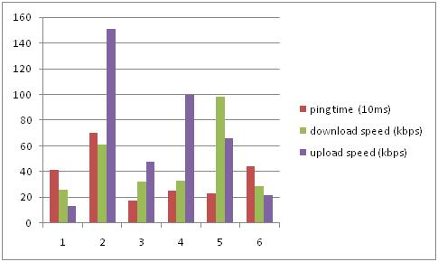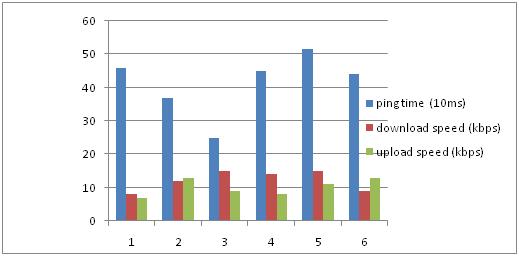 You can see from Figure 2 that there is a high variation in the results between the test runs. In particular the coefficient of variation (CV-standard deviation/mean) are over 50% for all measurements. This indicates that 3G users experience extreme variation in their application performance when accessing the network especially for upload speed.