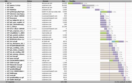 Let's do some analysis. We used Shunra's NV to get the following figures that show a waterfall timeline view for http://abcnews.go.com/m tested with3G on Samsang Galaxy 3 (Android 4.1 platform).