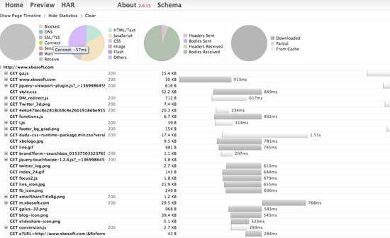 As you can see, it shows each object and the load time along with other statistics shown in the pie chart. On the pie chart, when you mouse over the different types of delays (blocked, DNS, SSL, etc.), you can see the time delay. In this instance, we can see that the connect time is 57 ms. This is much different than just examining download speeds because the connect times which are the time that the server establishes communication with the browser, can be influenced by protocols and packet sizes as they initially begin to start communicating. This is more dependent on the network itself and its configuration rather than the pure speed of the network itself. In this way, you can see if your application is suited for, or can be tuned to communicate better depending on the network it is predominately used on. Looking down further in the chart, we also see that m.xbosoft.com was loaded about halfway down the page with a download time of 700+ ms. With this kind of information, you can really dig into what could be slowing things down and possibly examine the order of things that could effect the user experience.