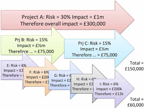 Imagine a project manager embarking on project A. The project is valued at $1,000,000 and his analysis tells him there is a 30% risk of failure. Thus the weighted risk is $300,000. To keep things simple I'll assume value and risk are spread equally across the whole project.