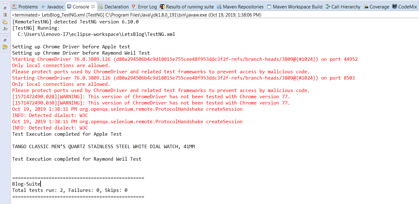 Right-click on the TestNG XML file and select Run As-> TestNG Suite to get the below console output: