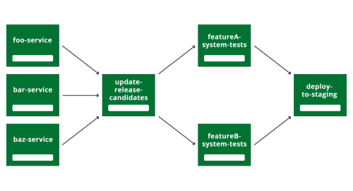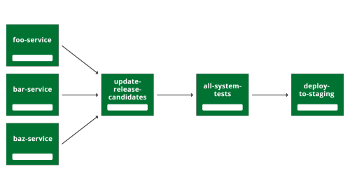 If you look at Figure 3, you can see the first way we arranged our build pipeline. When anyone pushes to any of the services (foo, bar or baz service) it triggers a new build of 'update-release-candidates' which updates the list of all the latest versions of all the services. Then we test these versions of the services running at the same time, in all the all-system-tests pipeline. If they all pass, then the 'deploy-to-staging' pipeline becomes available to run (we actually trigger it manually so we don't disturb other work going on there).