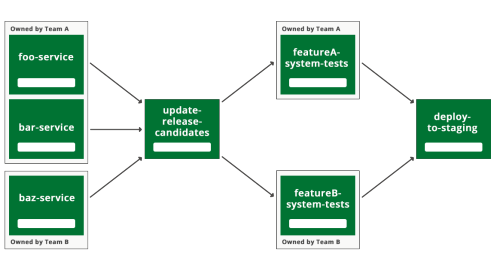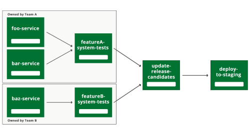 Crucially, if team A introduces a change in one of their services that break their system tests, it should only stop team A from deploying their service. All the other teams keep running with the 'release candidate' version.