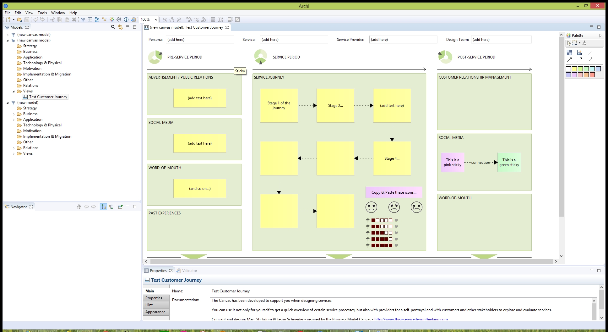 Archi offers also two types of diagrams that are outside the ArchiMate standard: the sketch and the canvas. These are generic diagrams that you can use to model some high level business contexts or processes. Some examples of canvas diagrams are supplied with the tool.