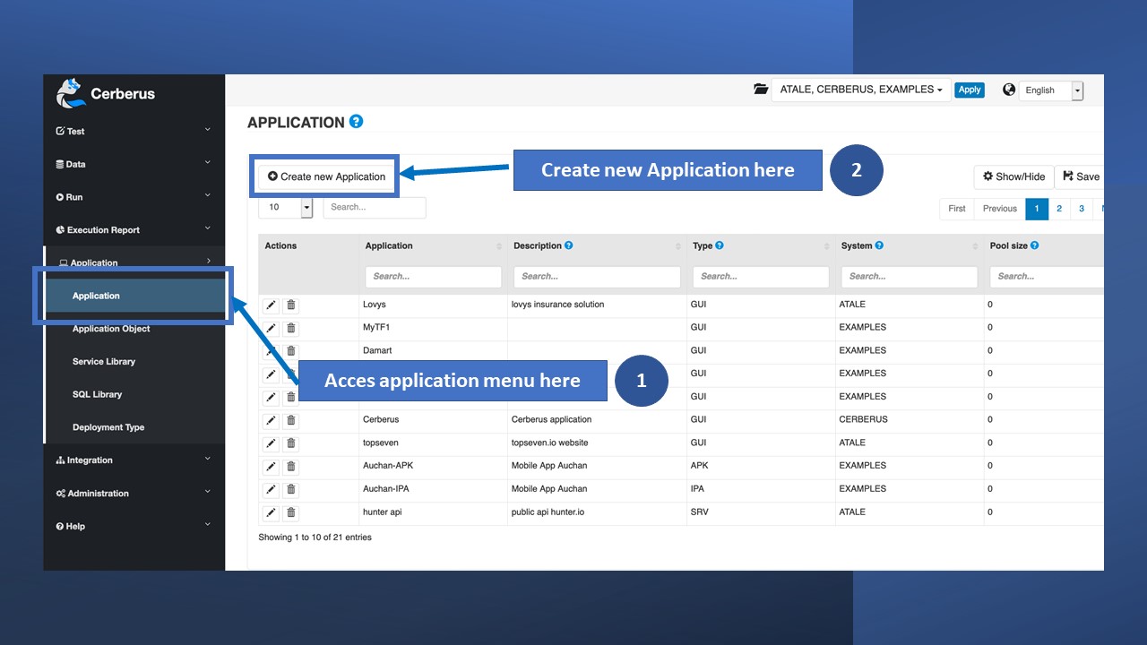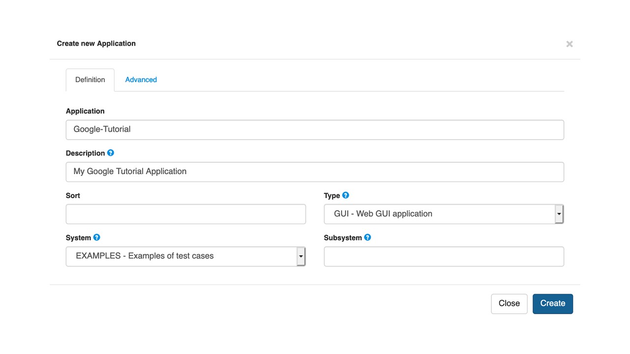 The first step is to create the application that we will then use in our test case. This will enable us to reuse the same application definition across different tests, simplifying their maintenance. It involves defining the application name, description, typology and available environments.