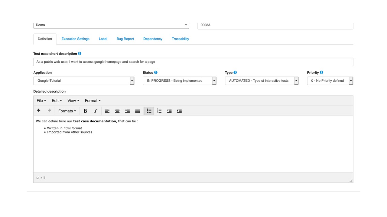 Status : The implementation state of your test case, in our example we will pass it to “IN PROGRESS”. For information, the status can be used as test execution criterias and a dashboard is available on the homepage.