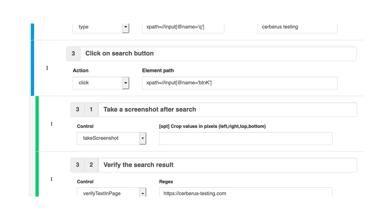 Control verifyTextInPage : In this case we will verify that the link https://cerberus-testing.com is present with the page. A lot of other controls are available and described in the documentation.