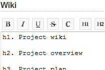 In addition to that, the rich wiki syntax is available not only in the wiki pages themselves but pretty much everywhere like issue descriptions and comments, news, forum posts, and so on. The wiki syntax supports shortcuts for often-used links such as links to issues (e.g. #123 automatically links to issue 123), versions, forum posts, revisions or commits of the project repository and more, as well as wiki macros which can automatically integrate other pages or generate content in your wiki page.