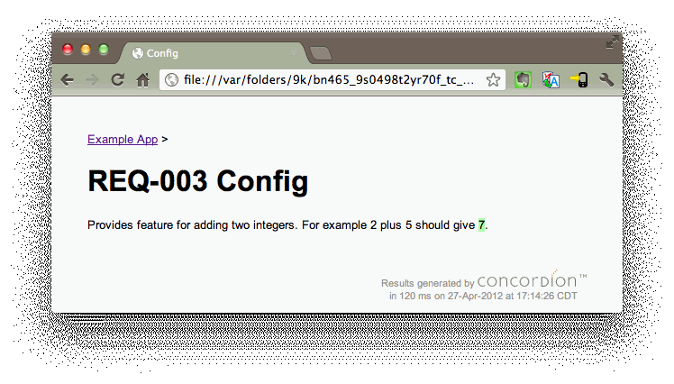 The implementation class uses name same as the XHTML specification, but with suffix Test, in this case Config.html and ConfigTest.java. The test connects the actual system being tested with the XHTML active specification. An instance of Configuration class is created, and then its method that adds two numbers is called. The result is passed back to the active specification. Upon executing the tests, the Concordion generates an output XHTML file, with inserted red or green highlights around the test results.