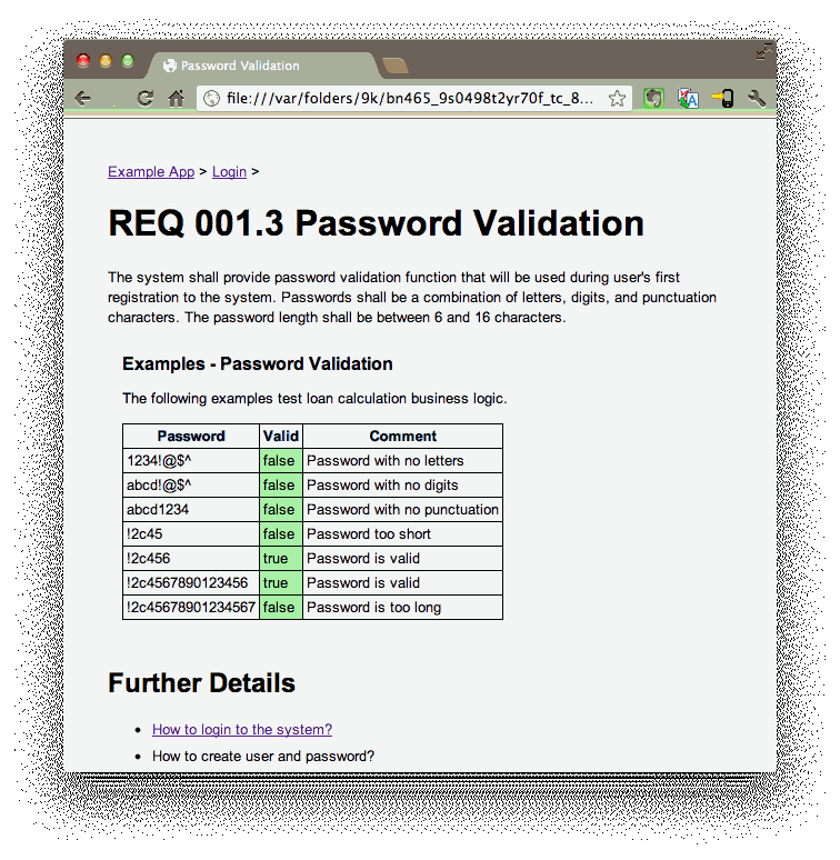 Additional benefit of using XHTML files for specifications is that we can use hyperlinks between the specifications. In the example above, this is illustrated with "Further Details" section that links to Password restrictions and validation.