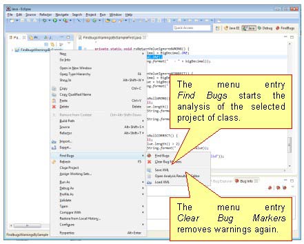 Working with Findbugs in Eclipse is easy and strait forward. To run the analysis, select your Java project or class. In the context menu you find then an entry Find Bugs (see Figure 1).